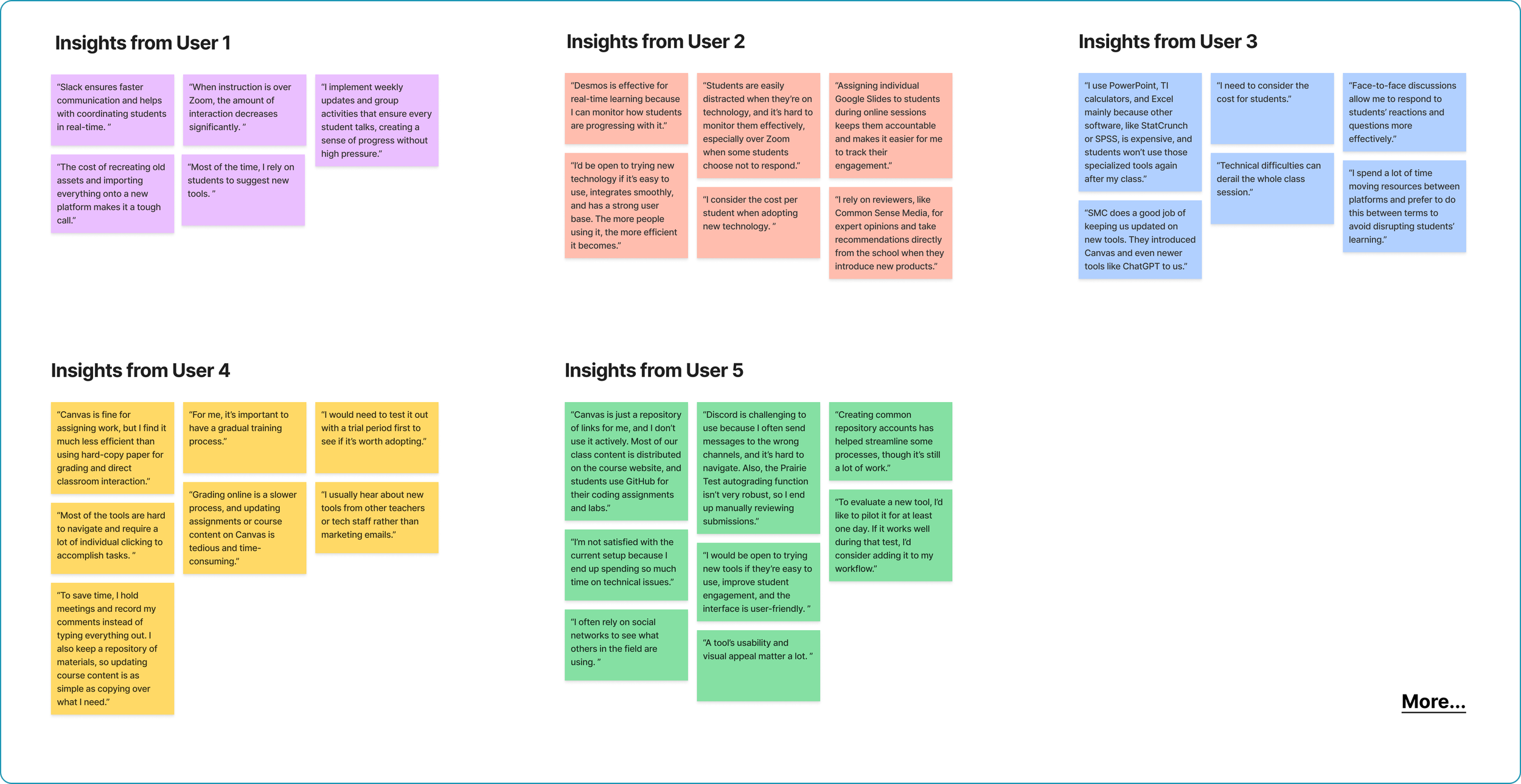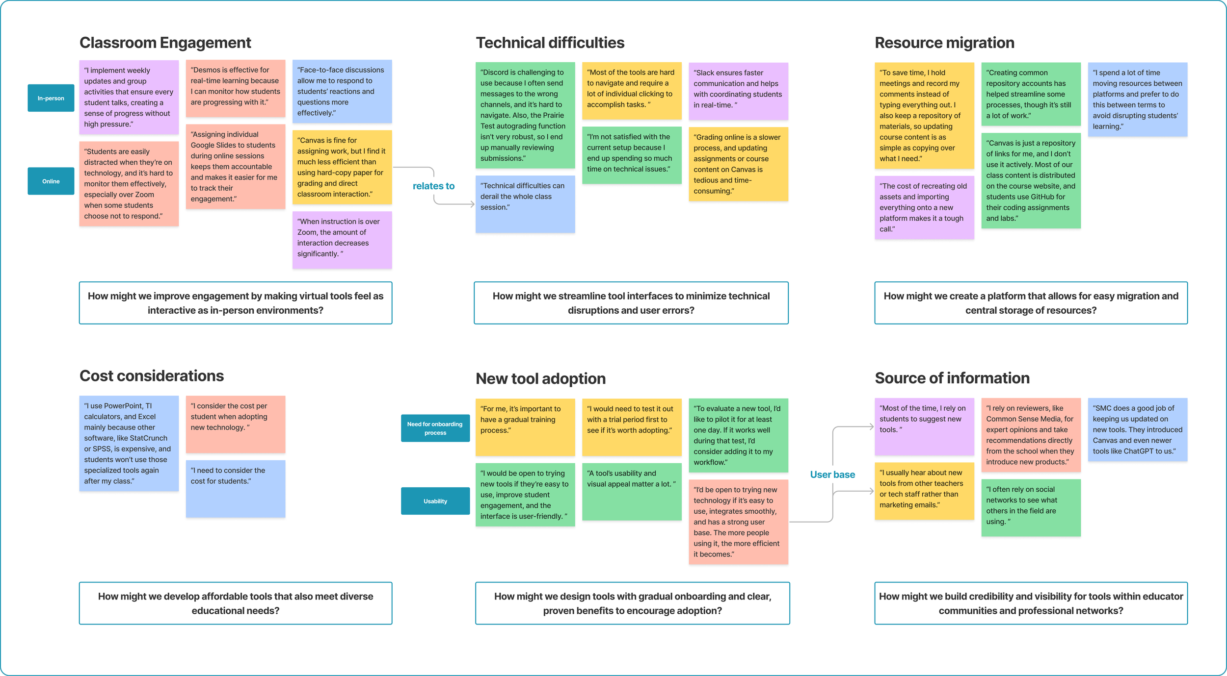 This step involved organizing qualitative data from user interviews into thematic clusters. 6 primary categories highlight users' needs and challenges with existing tools. Each section includes representative quotes and color-coded notes. This approach enables the identification of underlying patterns and "How might we" questions, setting the stage for targeted solutions that address educators' specific pain points and aspirations for improved technology use in teaching environments.