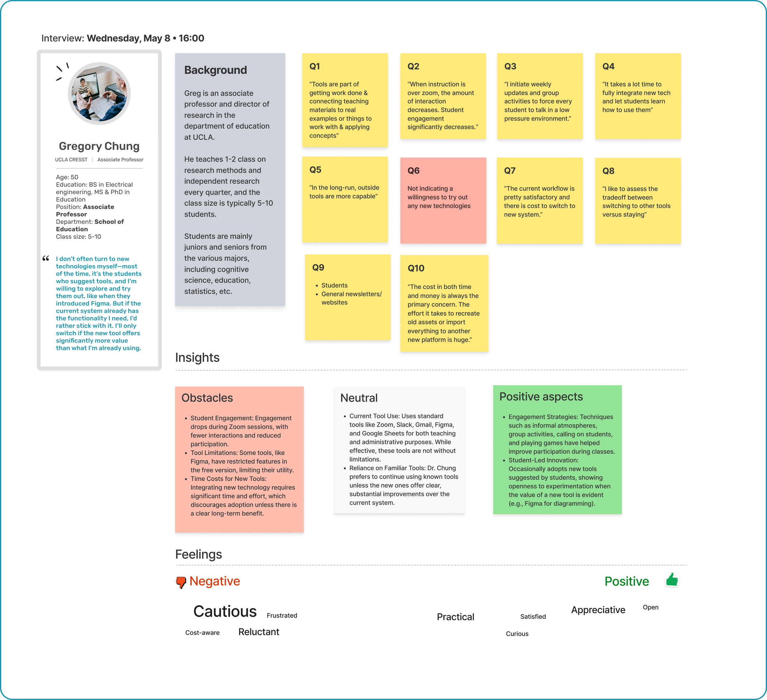 This step showcases individual data analyses from interviews with five educators, examining their unique experiences, preferences, and challenges with educational tools and classroom engagement. For each participant, insights were categorized into obstacles, neutral, and positive aspects, helping to identify both the common and unique needs across diverse teaching contexts. This approach allowed us to capture specific quotes, background information, and emotional responses, building a nuanced understanding of each educator’s workflow, pain points, and openness to adopting new technology.